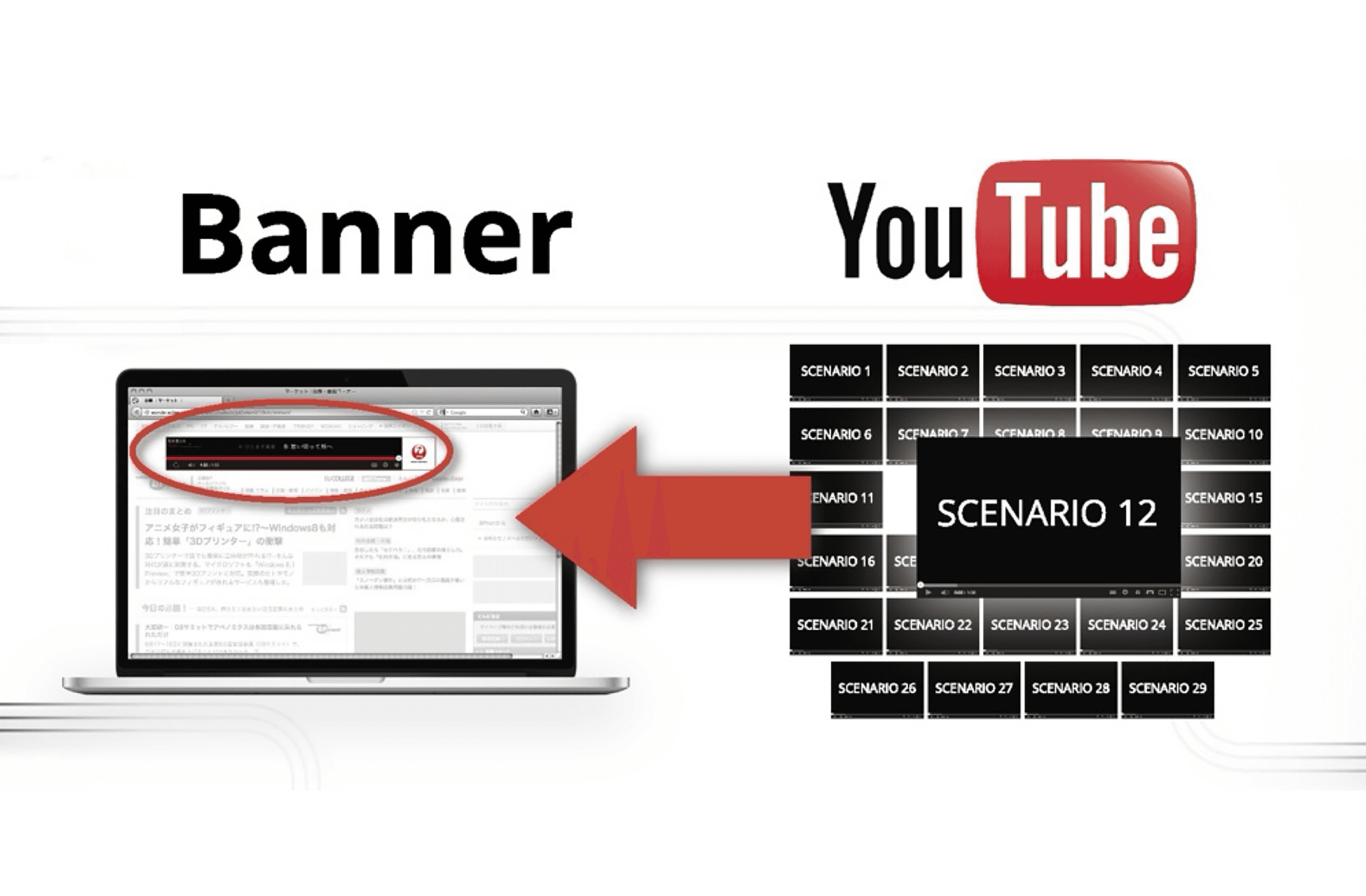 バナー広告上で音声ドラマのシナリオをユーザー自身が選択し、選択に応じ音声ファイルをYouTubeから読み込み再生させる「クロスメディアバナー体験」を提供することで「10cmの空間」を「10cmの時間」に転換しました。ストーリーバリエーションは計35種用意しました。
