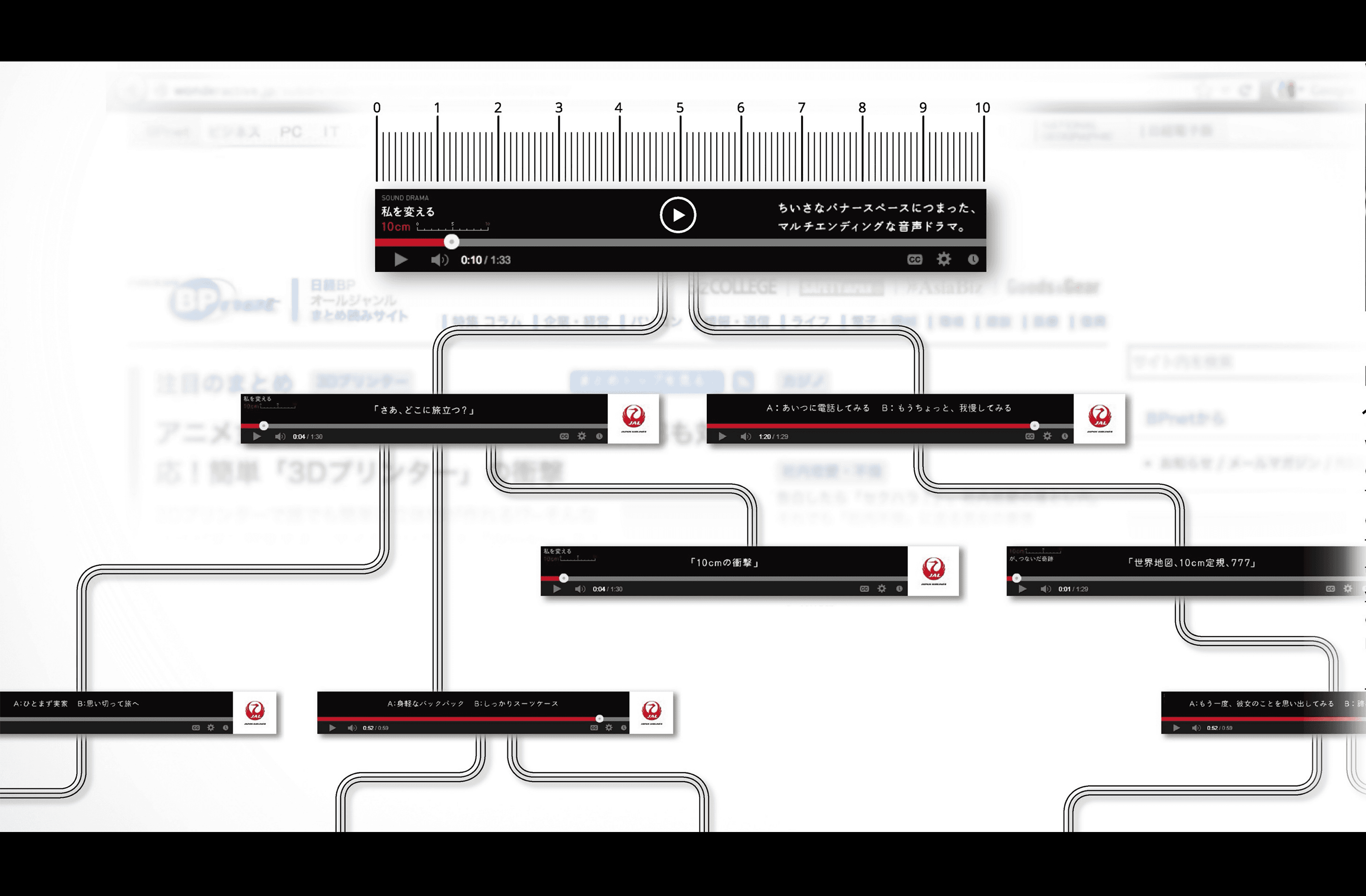 2013年、日本航空はエコノミークラスの乗客の足元スペースを10cm広げた新しい機体を東京ーロンドン便に導入しました。乗客にその10cm空間がもたらす「快適な時間」を感じてもらうために、かつてない、横幅約10cmのバナー広告で体験するインタラクティブ・サウンドドラマを実現させました。