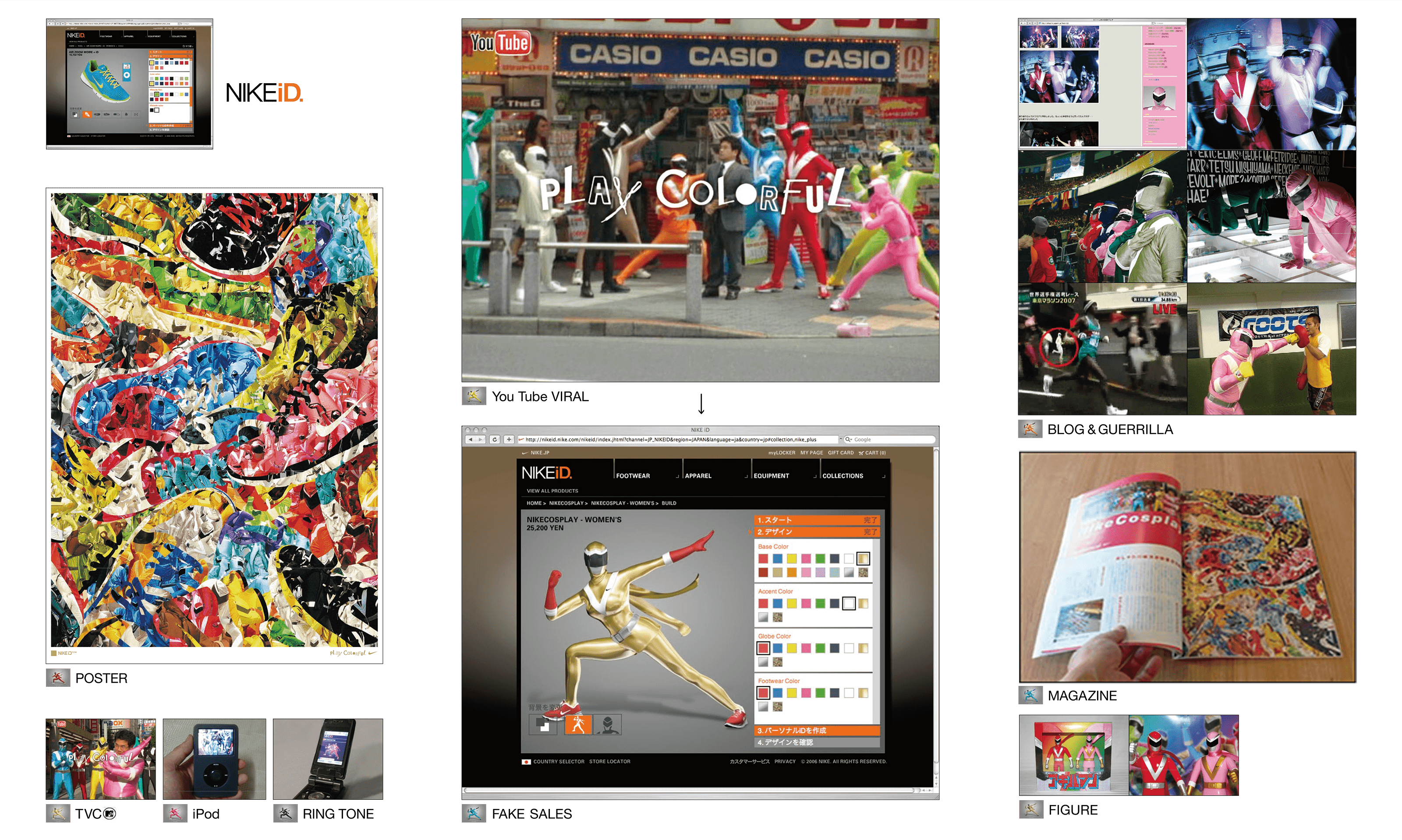 個性を押し殺したグレースーツのサラリーマンが覚醒し、NIKEiDでカラフルな人生を手に入れるこのリアルタイム’フェイク’ドキュメンタリーは 黎明期のYouTubeに公開したバイラルムービーに端を発し、コスプレの聖地である秋葉原のインスピレーションを世界へ拡散しました。 その後キャンペーンはTVCM、ECサイトでのコスチュームのフェイク販売、さらにはリアルシーンへのゲリラ出現など。 あらゆる生活シーンをカラフルに駆け巡りました。