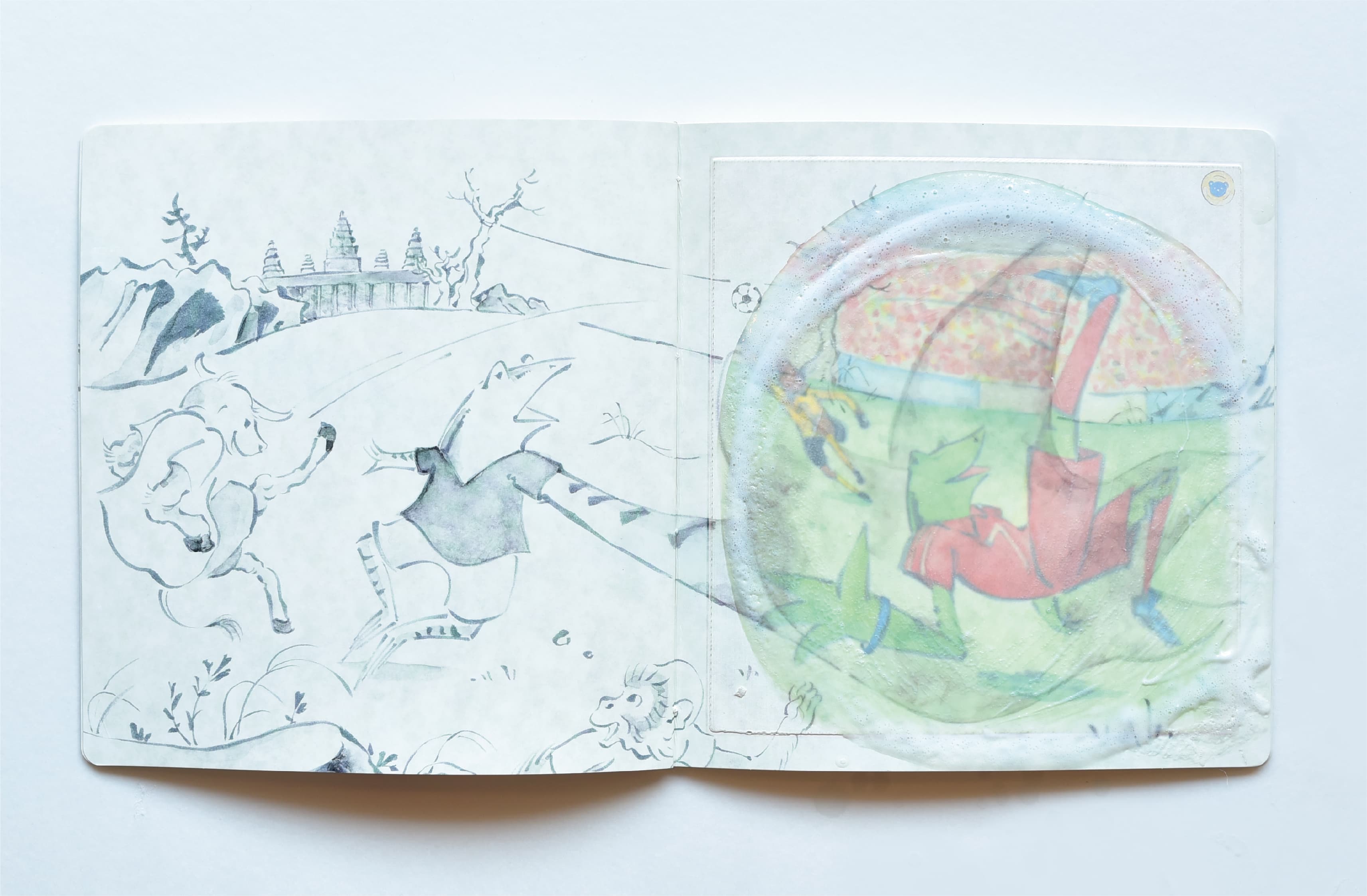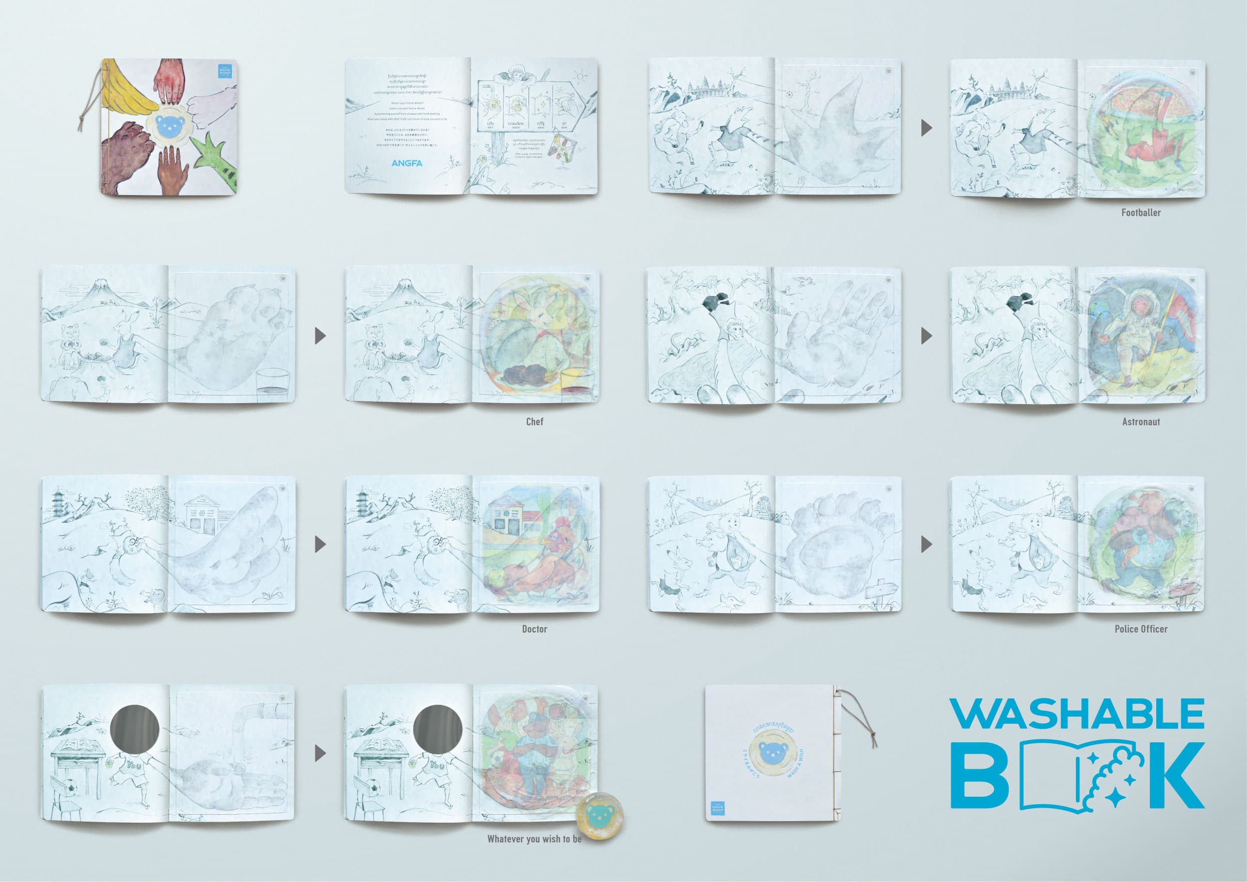 Washable Bookは「石鹸で洗って読む」という新しい絵本体験を提供します。文字を読むのではなく「ページを洗って物語を楽しむ」という身体的体験は、識字率や年齢を問わず子供たちが楽しく学べることを目的としました。「三層水透かし印刷」技術を応用しており、ページのキャラクターの汚れた手を石鹸で洗うと、その先の未来として夢が叶ったキャラクターの姿が現れます。